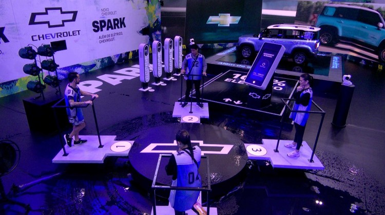 Os jogadores estão em cima de uma base em uma plataforma giratória, cada um deles segue com as suas 5 fichas, que podem ser usadas ao longo da prova, para fazer uma recarga agendada.